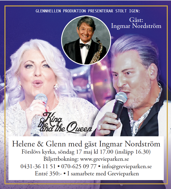En unik konsrt med Helene & Glenn Wish tillsammans med den legendariska saxofonisten Ingmar Nordström. En trio som sällan skådats! Förslövs kyrka söndagen den 17 maj – bokas via Grevieparken och deras mail på info@grevieparken.se
